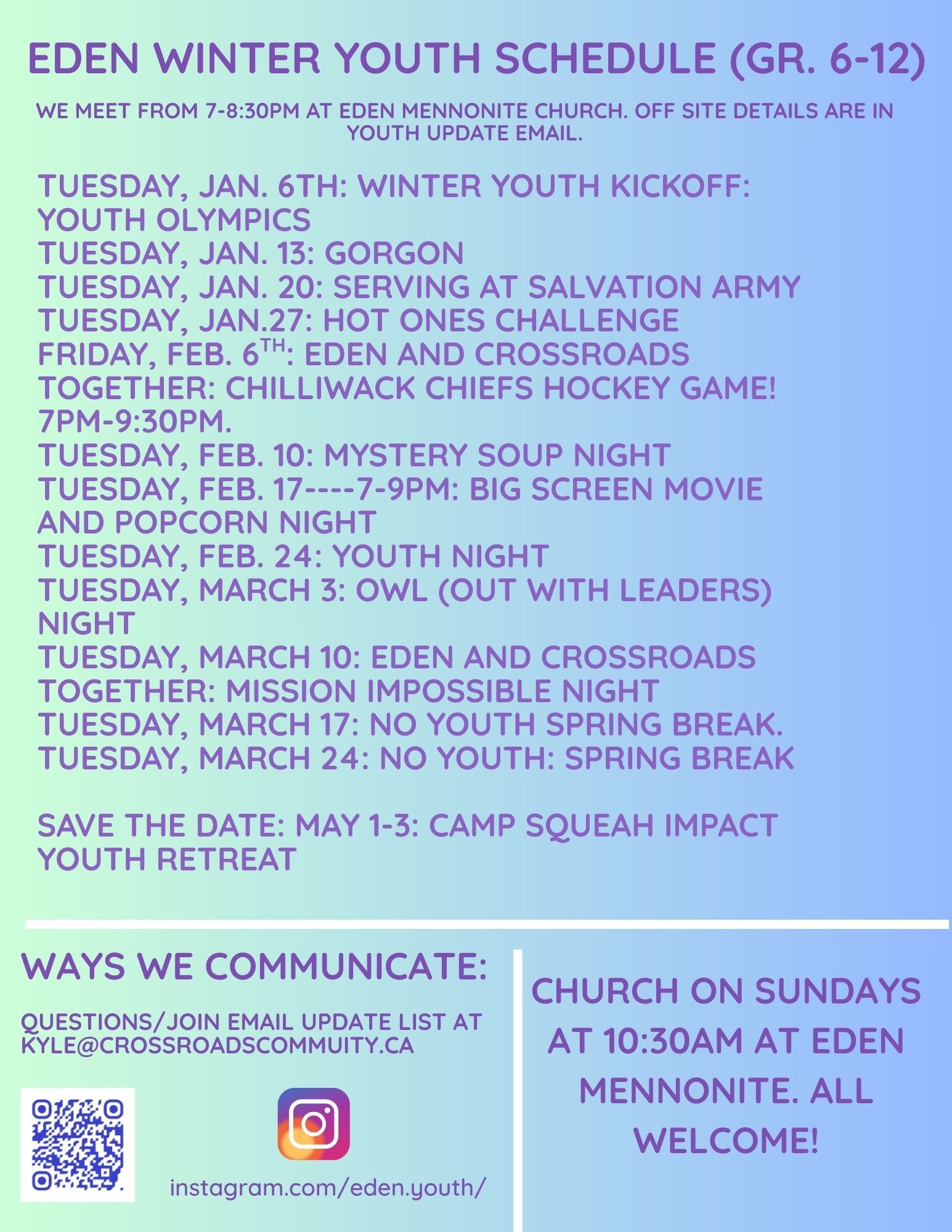 We meet on Tuesday nights (7:00-8:30pm) at Eden Mennonite Church. If you are in Grade 6-12, then come hang out, play some games, and we'll learn about what it means to follow Jesus together. For the latest info, follow our Instagram page or join our weekly email update. If you would like to join our email list or have questions please contact Youth Pastor Kyle Dyck (kyle@crossroadscommunity.ca), in the office on Tuesdays.